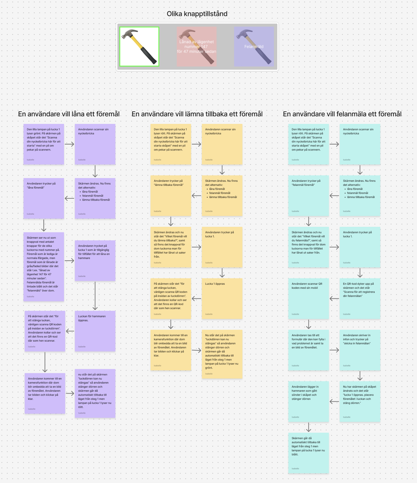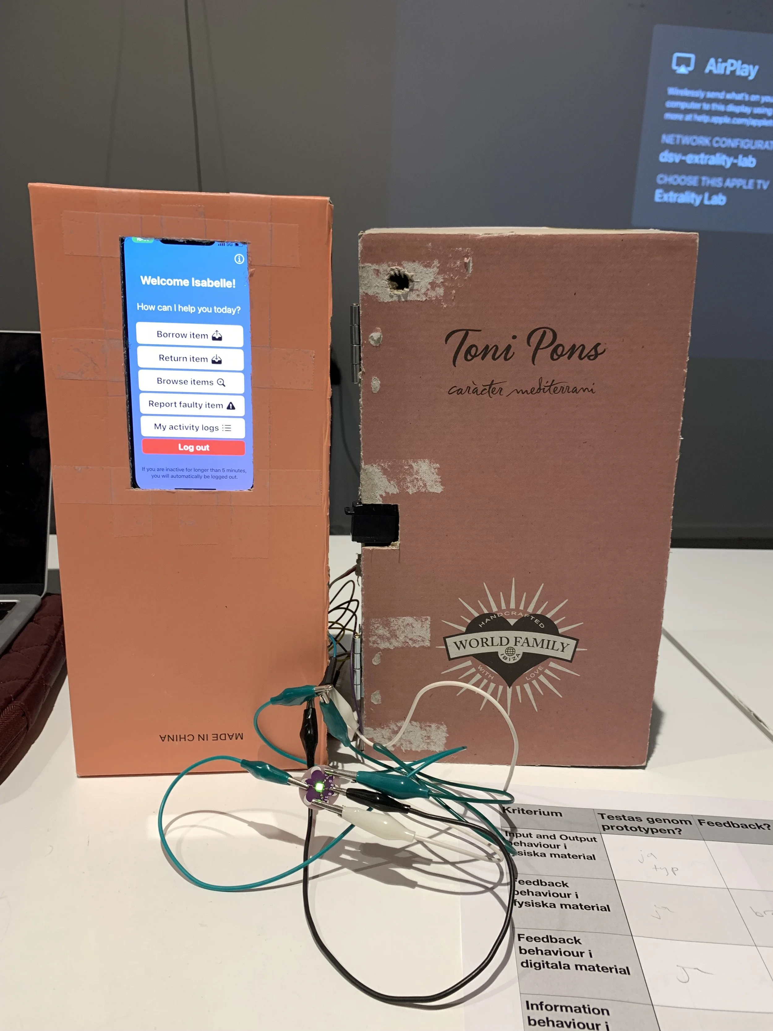 The locker has three main functions; to borrow items, return items or report faulty items. When an item is free, a green color is used in both the app icons and on the physical lamp, when it is borrowed, red and when it is reported, blue. The prototype also included pop-ups and sound effects.