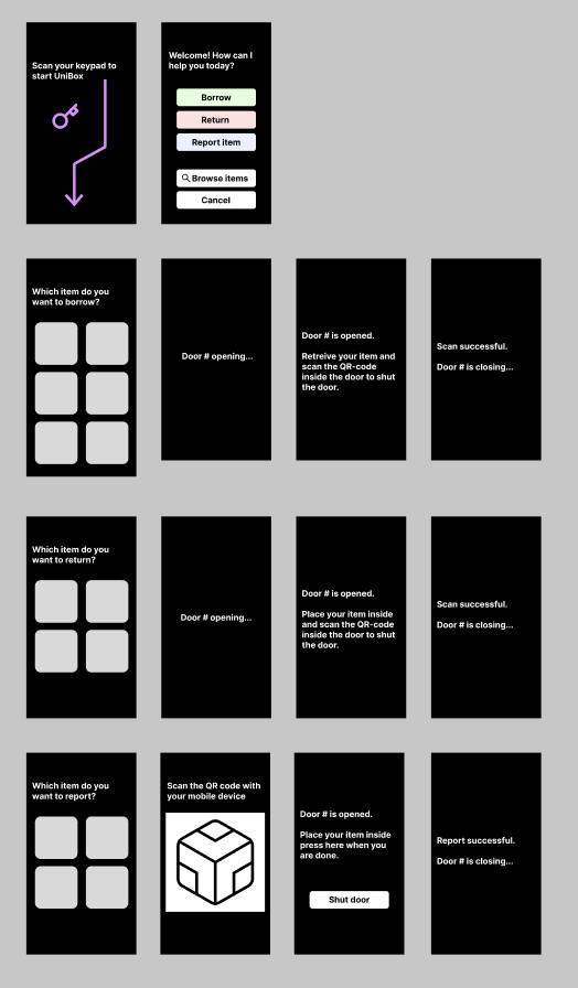 I also assembled Arduino components and wrote code that would correspond nicely with the actions possible on the screen. For example, when borrowing an item, the screen would encourage the user to scan his/her RFID tag and press a button when finished. When they did this, the door would open and the borrow would be successful. In this way, I did not have to use any Wizard-of-Oz techniques while showcasing the prototype.