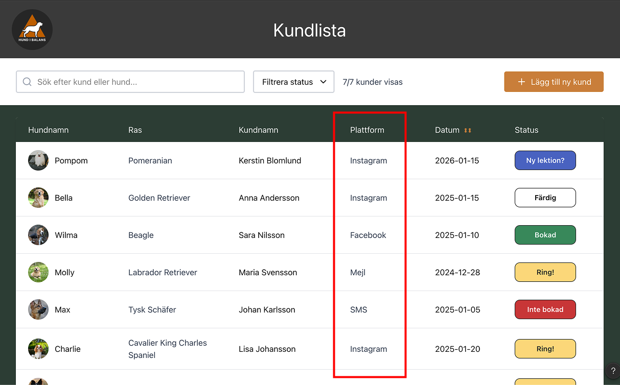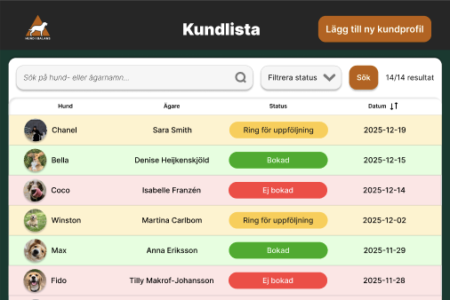 The dog trainers receives booking requests from multiple channels and platforms such as via Instagram, calls, their website and more. This made it difficult for them to keep track of which clients were in need of being contacted in order to discover whether more lessons were needed. We created a visible status icon in the main database table that can be changed as needed. The status options are customized for the company’s needs and work flows.